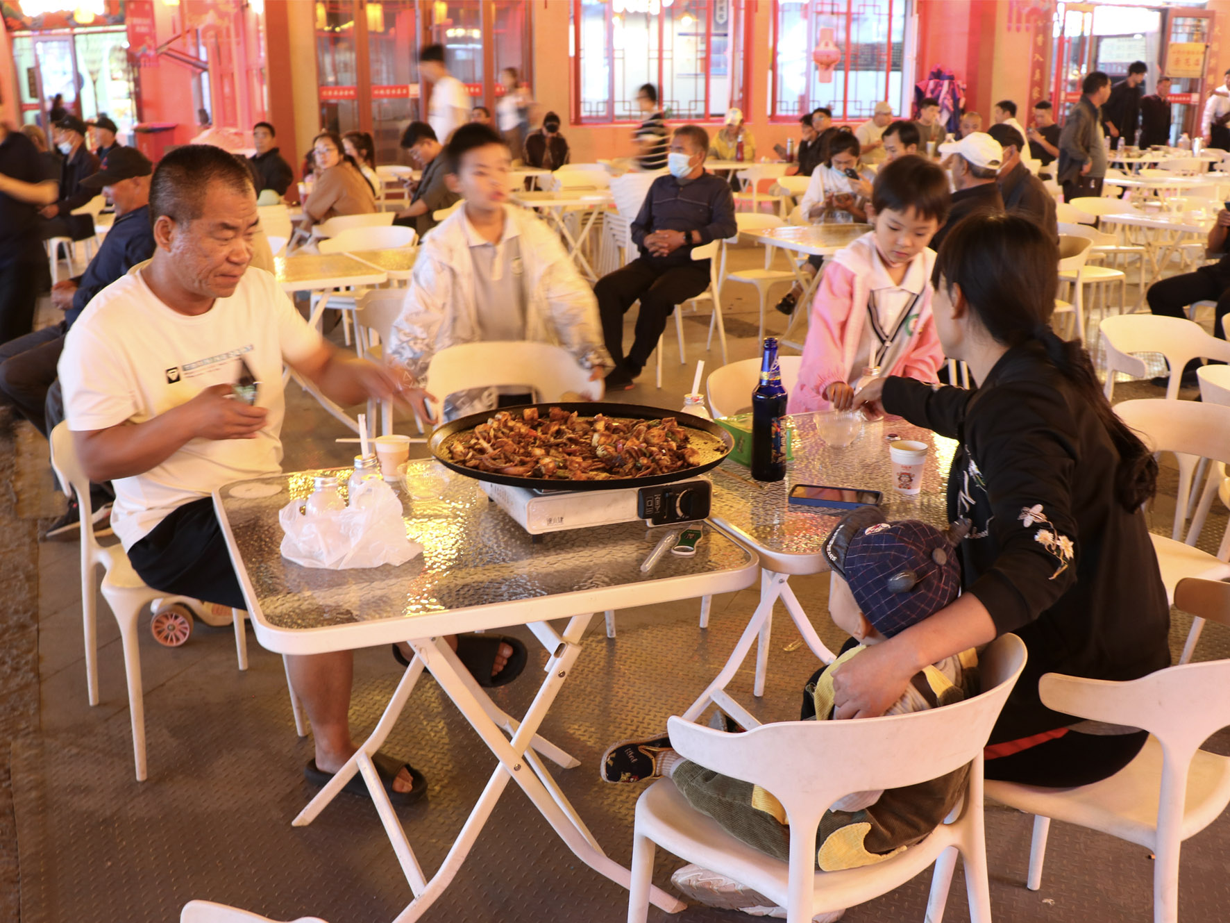 沒有過多的餐具,鐵鏊為盤,再添置幾副筷子,配上一杯甘甜的米酒或棗茶,一桌人圍坐在小桌前盡享美味,熱鬧非凡。