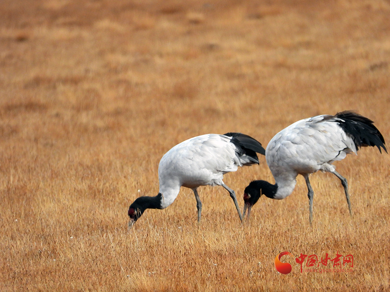 中國(guó)甘肅網(wǎng)10月17日訊 (西北角·中國(guó)甘肅網(wǎng)記者 張慧雅)近日,甘肅祁連山國(guó)家級(jí)自然保護(hù)區(qū)工作人員在轄區(qū)巡護(hù)時(shí)偶遇國(guó)家一級(jí)保護(hù)野生動(dòng)物黑頸鶴歇息覓食的場(chǎng)景,兩只黑頸鶴漫步在一處濕地中一邊欣賞美景一邊享用美食。