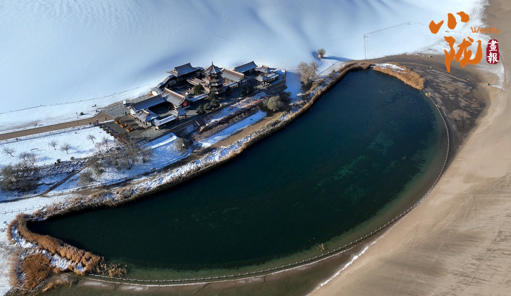 從空中俯瞰,漫漫沙漠覆蓋著白雪,月牙泉成了沙漠的眼睛,構(gòu)成另一幅美麗的沙海畫卷。