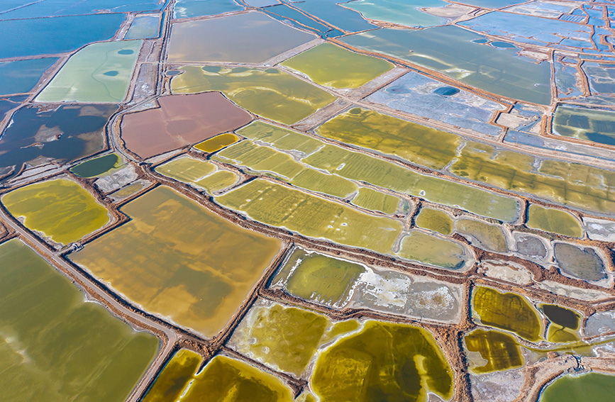 冬日時節(jié),隨著氣溫降低,山西運(yùn)城鹽湖湖面上,色彩斑斕、景色如畫。芒硝結(jié)晶,“硝花”似雪,鹽湖里各種線條和幾何圖案,猶如大自然的調(diào)色盤,十分迷人。