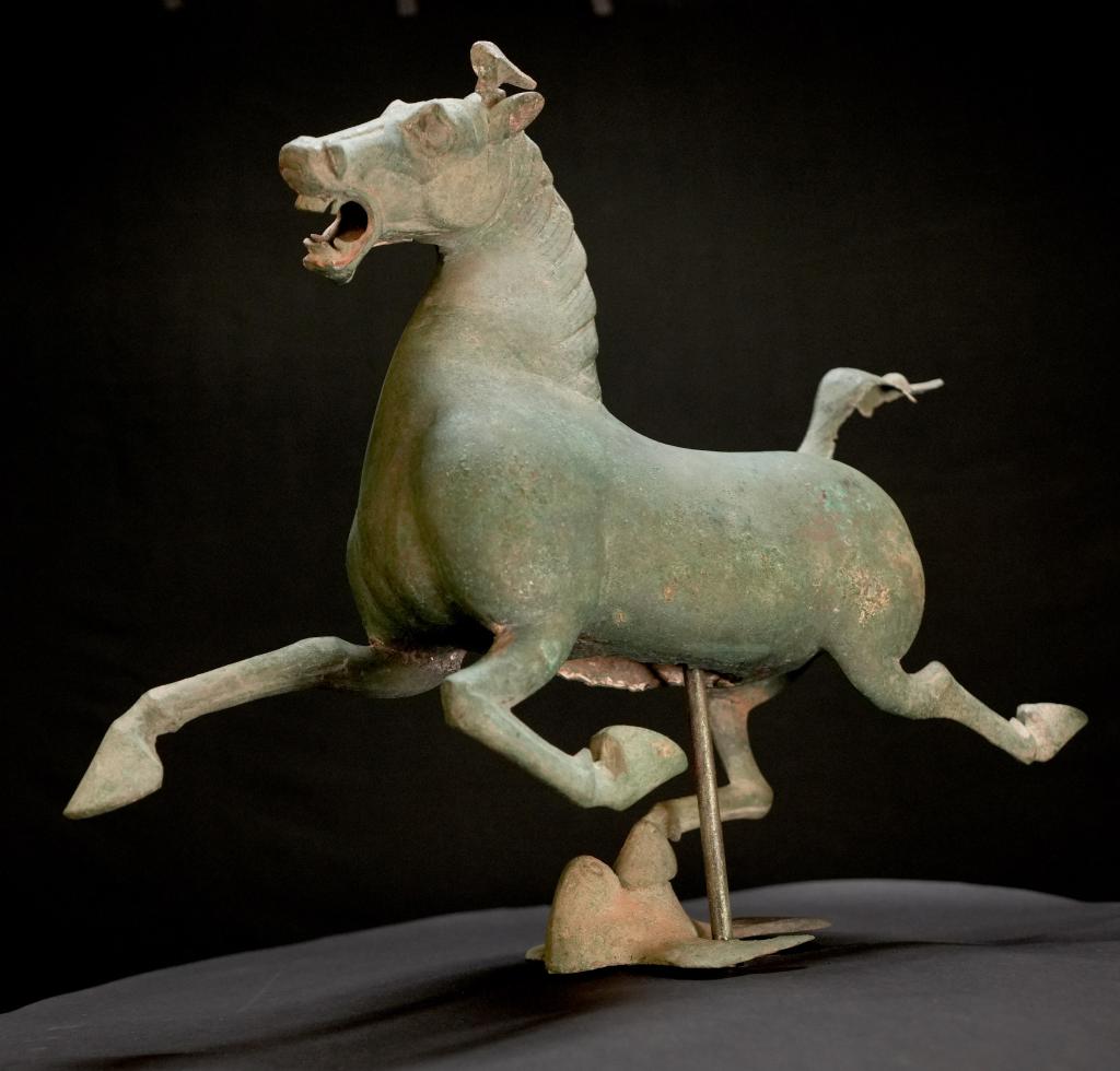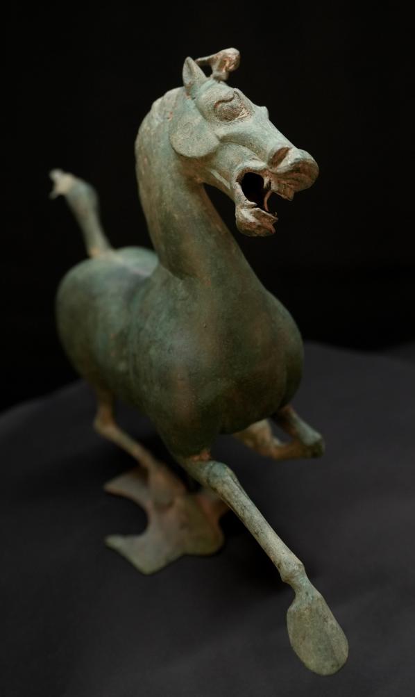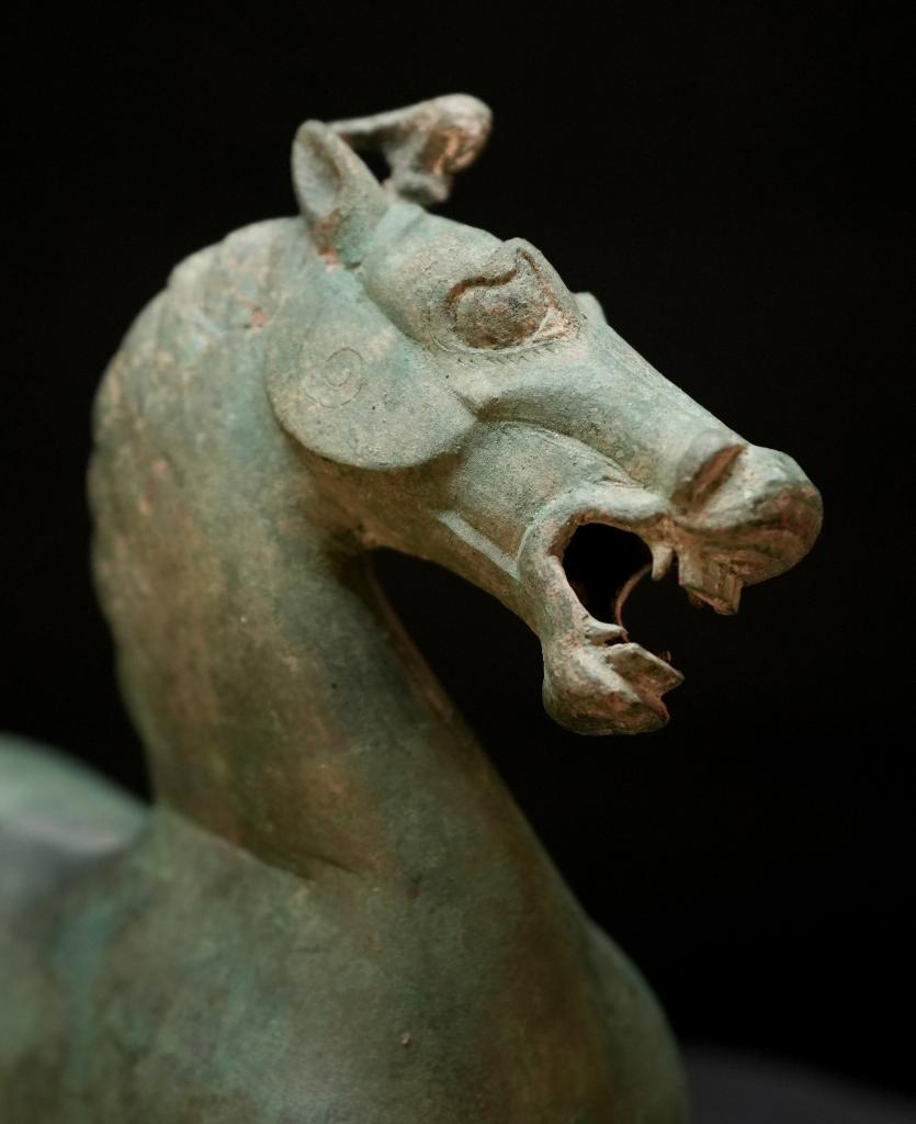 馬兒如在空中飛馳,一足踏上飛鳥的剎那,飛鳥回首驚顧。細細觀之,馬的口、眼、鼻均張開,鬃毛和尾絲后揚,令人仿若聽見馬兒奔騰的嘶鳴和風(fēng)嘯聲,靜態(tài)的青銅器充滿靈動之感。