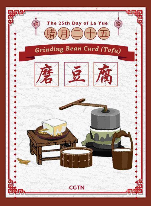 傳說(shuō)玉皇大帝會(huì)在臘月二十五下凡巡視人間,看家家戶戶是否都過(guò)著誠(chéng)實(shí)勤儉的生活。為了表現(xiàn)得節(jié)儉以獲得玉皇大帝降福,傳統(tǒng)上人們會(huì)磨豆腐來(lái)吃,豆腐在中國(guó)是一種便宜的食品。