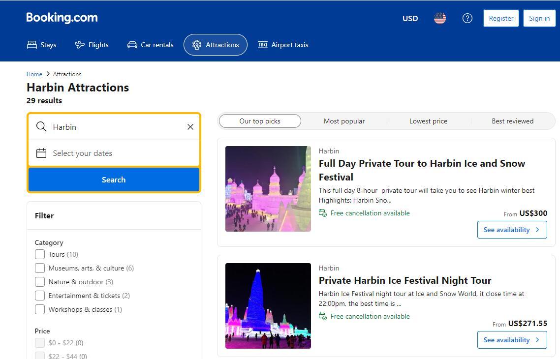 在酒店及住宿在線預訂平臺Booking.com上,可以搜索到近30個關(guān)于哈爾濱旅游的服務。其中,“哈爾濱冰雪節(jié)全日私人旅游”包括私人汽車和導游費用,不包括門票收費300美元,包括門票則收費480美元。“哈爾濱冰雪節(jié)私人夜游”包括私人汽車、私人旅游、酒店接送、門票,收費271.55美元起。