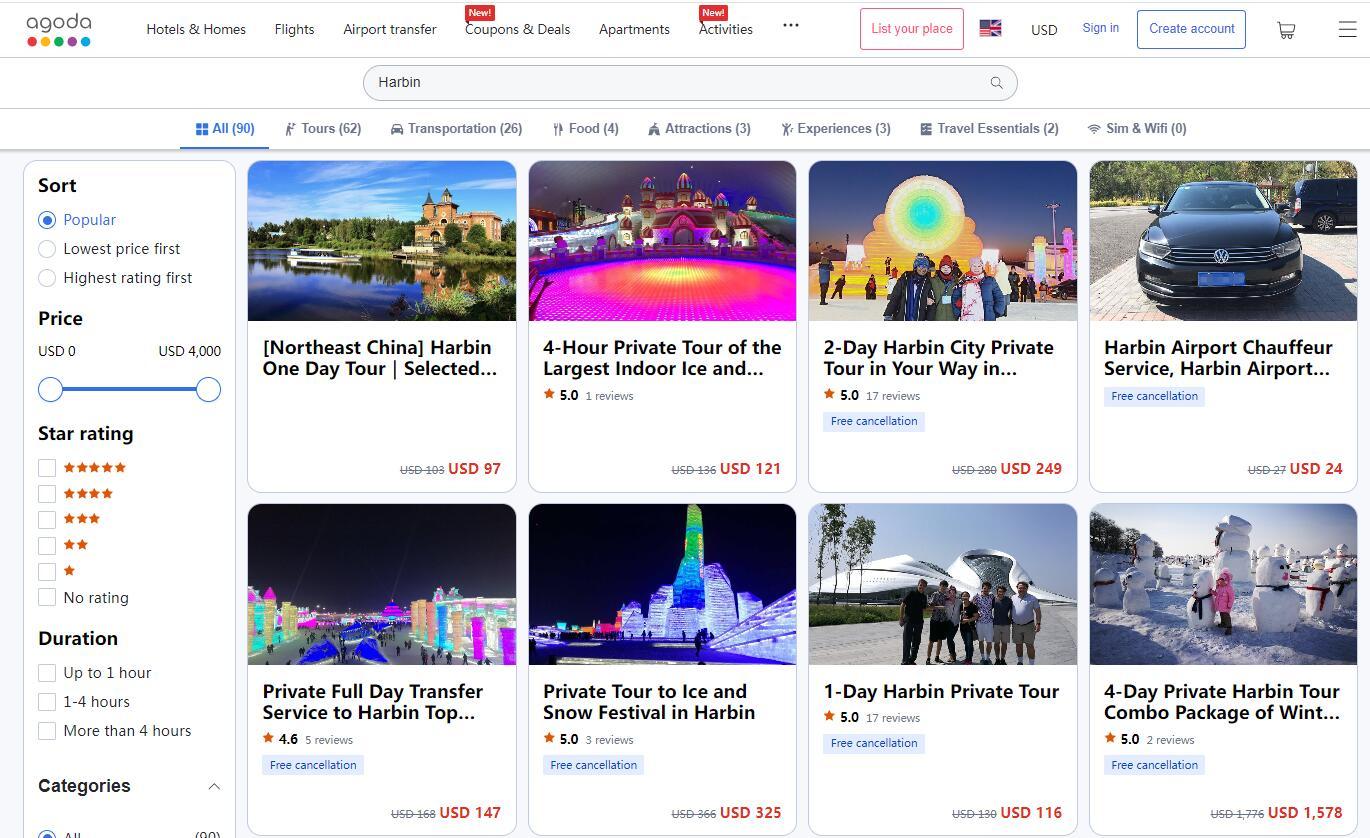 在線預訂平臺Agoda上也可以搜索到數(shù)十個關(guān)于哈爾濱旅游的服務。大約8小時的“哈爾濱一日游”,包括私人導游服務和用車費用,收費97美元起。為期2天的“哈爾濱市私人旅游”,包括私人導游服務、交通費(私人汽車或公交車/出租車)、酒店接送,收費249美元起。(中新網(wǎng)財經(jīng) 記者 吳家駒)