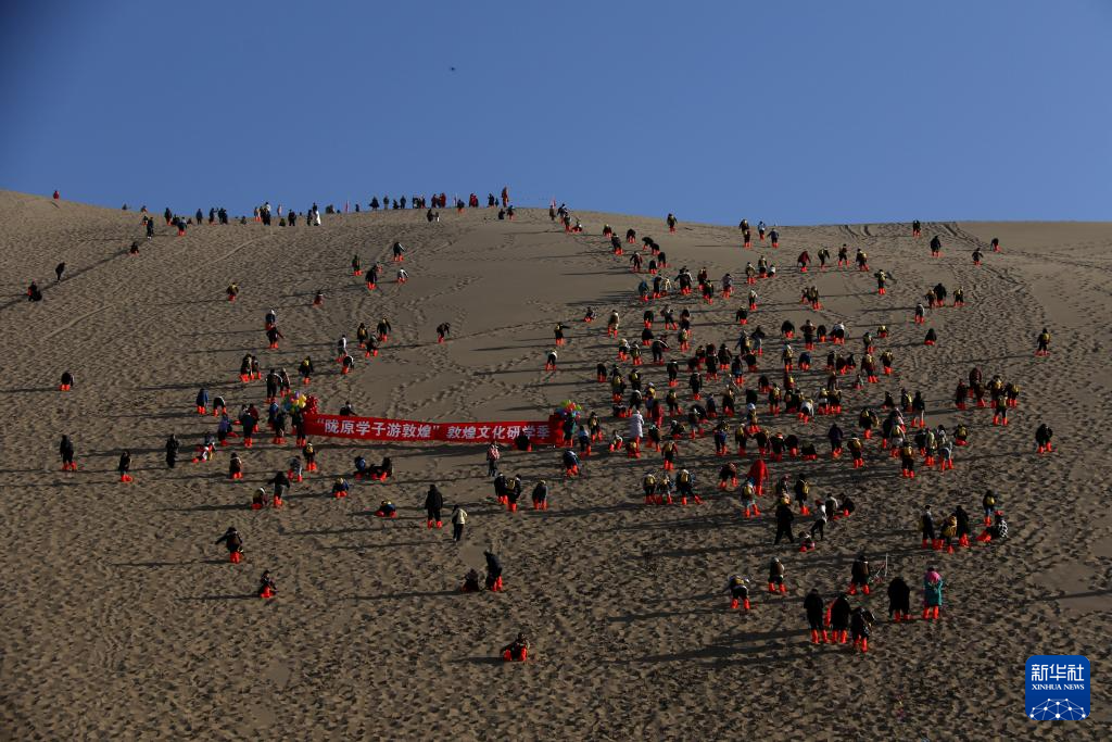 1月16日,研學(xué)團(tuán)隊(duì)學(xué)員在甘肅省敦煌市鳴沙山月牙泉景區(qū)開展登山比賽。新華社發(fā)(張曉亮 攝)