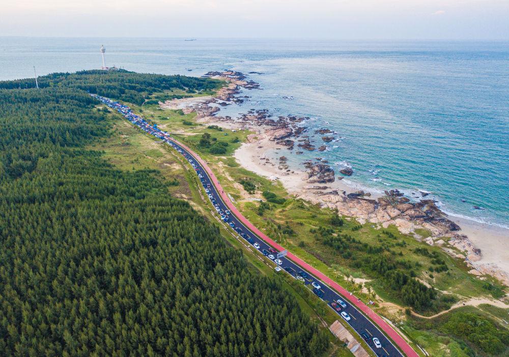 ↑2023年10月4日拍攝的海南環(huán)島旅游公路文昌段景色和自駕游車輛(無人機照片)。新華社記者 蒲曉旭 攝