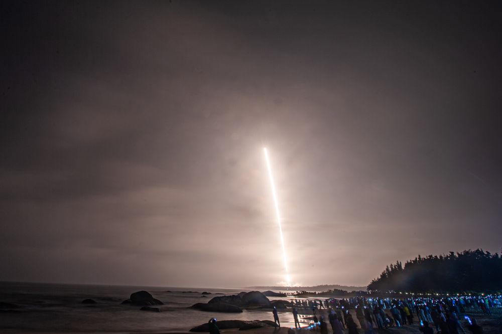 ↑長征七號改遙二運載火箭在海南文昌航天發(fā)射場發(fā)射,吸引眾多居民和游客在海邊觀看。新華社記者 蒲曉旭 攝