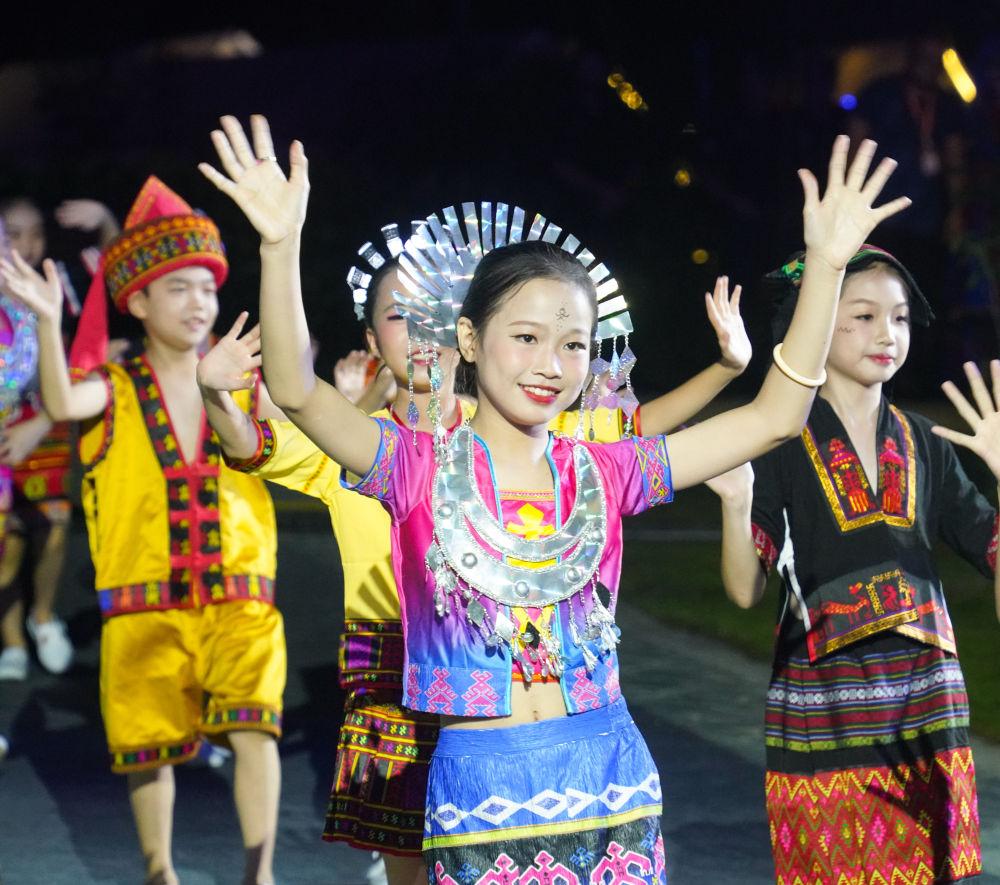 ↑2023年9月16日,海南省五指山市民族時裝“村秀”系列文化活動開幕。鄉(xiāng)鎮(zhèn)居民身著黎族、苗族傳統(tǒng)和創(chuàng)新設(shè)計服飾,向人們展示民族傳統(tǒng)文化的魅力。圖為展示服裝的小朋友與觀眾互動。新華社記者 樊雨晴 攝
