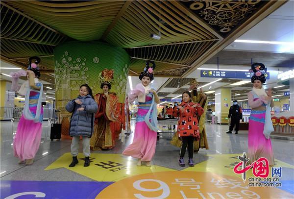 2020年底,西安地鐵9號(hào)線開通之際,華清池站帝妃攜仕女表演的《霓裳羽衣舞》,秦王攜眾臣高呼“我們有地鐵了”的聲音依舊回旋耳邊。時(shí)值龍年新春佳節(jié),廣大乘客在乘坐安全舒適西安地鐵9號(hào)線的同時(shí),將再次有機(jī)會(huì)在地鐵車站和地鐵列車上來一場“秦唐”文化的穿越之旅。