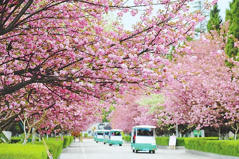 櫻花紅陌上,清香飄萬(wàn)里——景區(qū)內(nèi)平坦?jié)崈舻陌倜讬鸦ù蟮郎?,一樹樹粉白的呈現(xiàn),宛若一望無(wú)際的雪白云朵,柔美的櫻花肆無(wú)忌憚地開在道路兩旁。