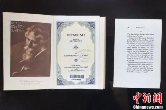 圖為清華大學(xué)圖書館收藏的紐約1916年英譯本泰戈?duì)栐?shī)集《吉檀迦利》。中新社記者 易海菲 攝