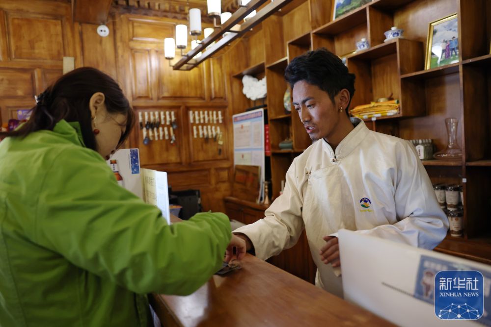 ↑ 扎尕那村一家民宿工作人員仁青(右)在為游客辦理入住(6月27日攝)。新華社記者 陳斌 攝