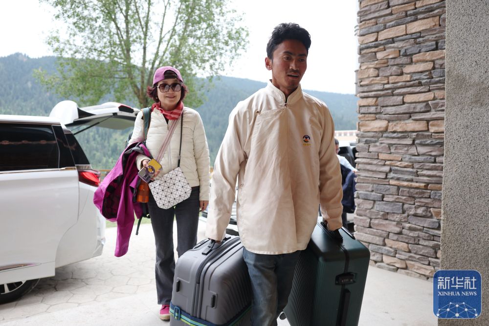 ↑ 扎尕那村一家民宿工作人員仁青(右)幫助前來(lái)住宿的游客搬運(yùn)行李(6月27日攝)。新華社記者 陳斌 攝