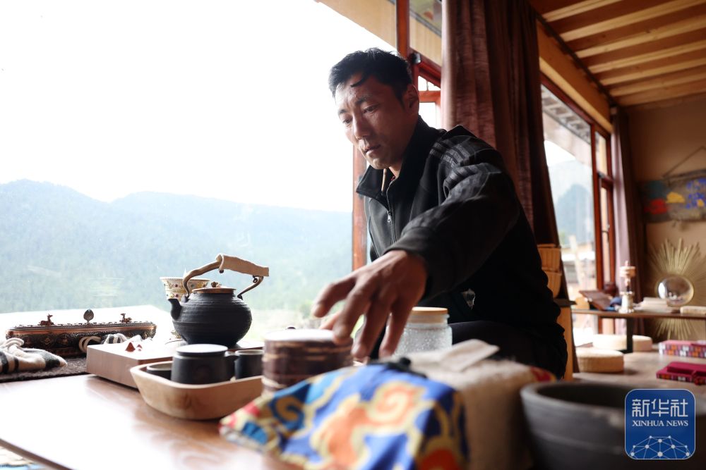 ↑ 扎尕那景區(qū)一家民宿經(jīng)營(yíng)者卓瑪交在自家的民宿里整理茶臺(tái)(6月27日攝)。新華社記者 方欣 攝