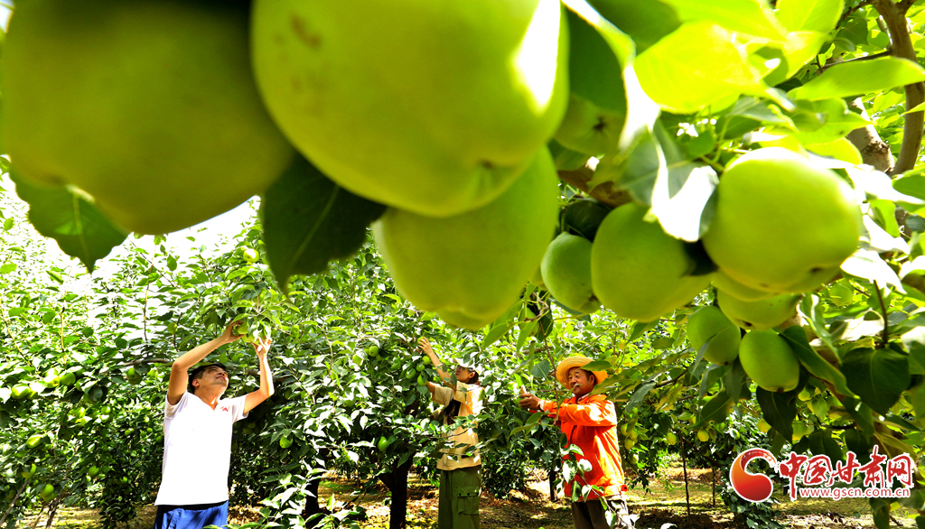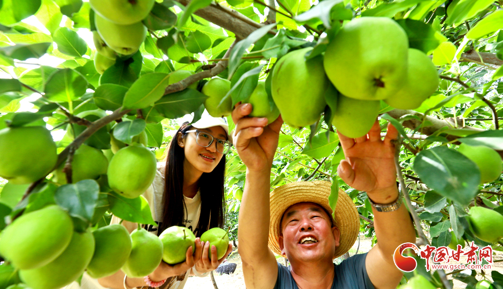 8月12日,在張掖市甘州區(qū)農(nóng)墾張掖農(nóng)場綠色果品種植基地,果農(nóng)們正在采摘成熟的早酥梨,基地里一派果豐人忙的喜人景象。