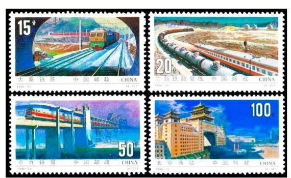 1996年9月,我國發(fā)行編號為1996-22的《鐵路建設(shè)》郵票一套四枚,其中T4-2圖為蘭新鐵路復(fù)線。票面上,一貨一客兩列火車蜿蜒在蘭新鐵路復(fù)線,氣勢如虹。而嘉峪關(guān)關(guān)城作為一個地理標(biāo)志,被處理成蘭新鐵路復(fù)線的背景圖案,放在郵票主圖的后方。盡管由于票面所限,背景圖案上的嘉峪關(guān)關(guān)城畫面很小,無以淋漓盡致地表現(xiàn)嘉峪關(guān)城樓的細(xì)節(jié),但其“天下第一雄關(guān)”的雄姿絲毫不減。而嘉峪關(guān)出現(xiàn)在表現(xiàn)甘肅特色乃至蘭新交通主線的票面上,也足見其地理位置的重要性。