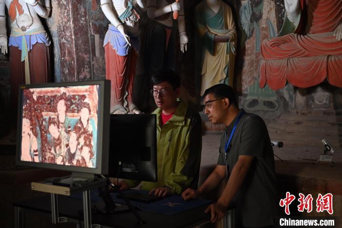 6月5日,敦煌莫高窟內,敦煌研究院文物數(shù)字化研究所工作人員進行敦煌壁畫數(shù)字化圖像現(xiàn)場檢查工作。中新社記者 李亞龍 攝