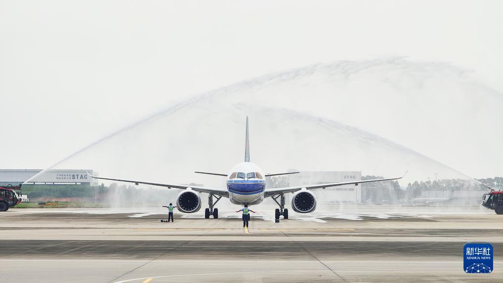 8月29日,南航首架C919國產(chǎn)大飛機(jī)在廣州白云國際機(jī)場緩緩穿過“水門”。新華社發(fā)