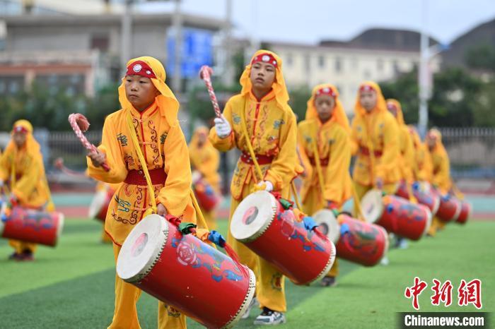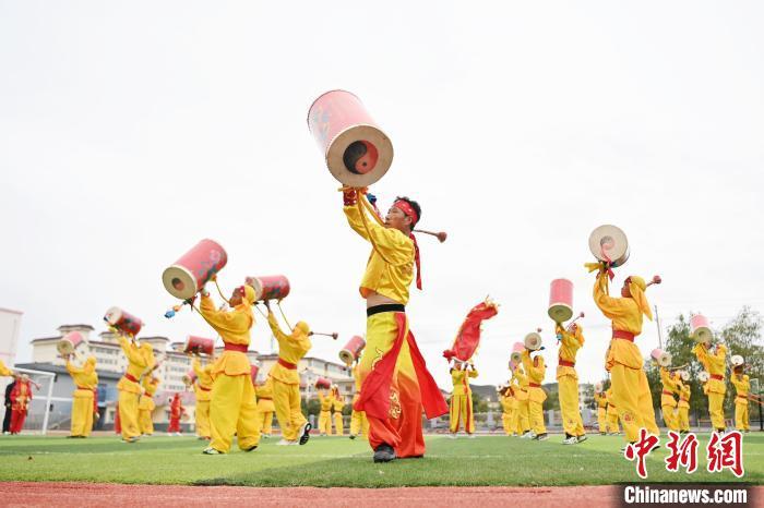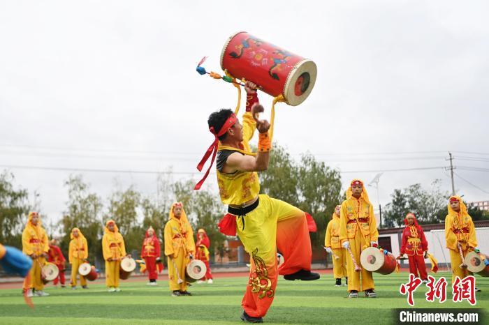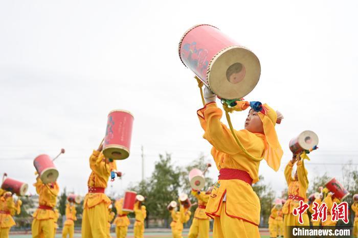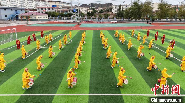 9月9日,甘肅省蘭州市皋蘭縣三川口學(xué)校學(xué)生練習(xí)蘭州太平鼓。近年來,皋蘭縣將國家級非物質(zhì)文化遺產(chǎn)蘭州太平鼓納入各中小學(xué)課后服務(wù)內(nèi)容,成立中小學(xué)太平鼓隊(duì)13支,定期邀請非遺傳承人走進(jìn)校園,進(jìn)行傳統(tǒng)文化授課和培訓(xùn),使學(xué)生親身感受中華優(yōu)秀傳統(tǒng)文化的魅力。蘭州太平鼓舞已有六百余年的歷史,素有“天下第一鼓”之稱,2006年被列入中國第一批非物質(zhì)文化遺產(chǎn)名錄。中新社記者 九美旦增 攝