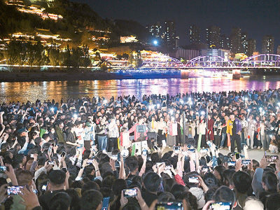 在黃河蘭州段近水平臺,市民及游客參與蘭州黃河大合唱活動?! ⌒氯A社記者 范培珅攝