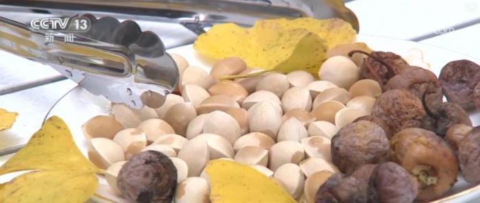 身在銀杏村,這里的鄉(xiāng)親們也是開發(fā)研制出了很多既安全又美味,還能發(fā)揮銀杏果“藥食兩用”特性的特色美食。村子里最常見的,是用炭火慢慢翻炒出的干果。還有將銀杏果、松子、核桃和芝麻等食材混合炒熟,再用木錘使勁敲平制成的銀杏酥,味道也是油潤(rùn)香甜。
