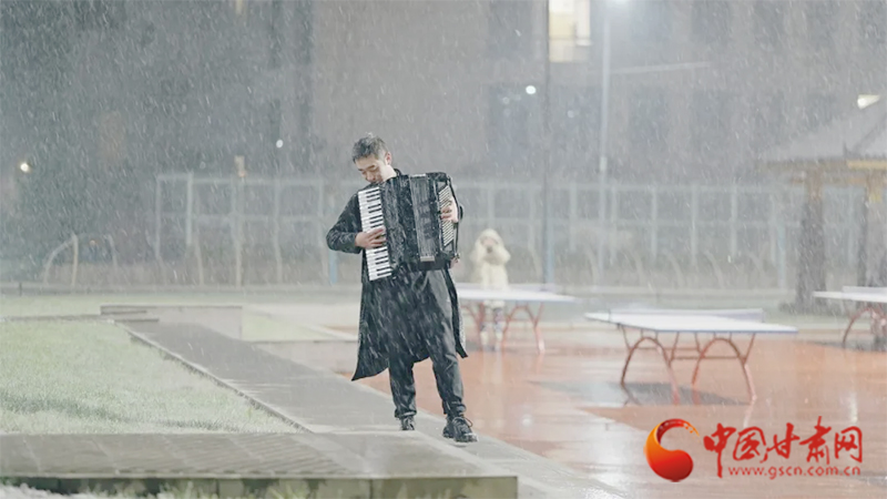 鏡頭中,在蘭州大學(xué)榆中校區(qū),手風(fēng)琴聲伴隨著雪花,一位同學(xué)在雪中輕輕擺動著身體,引得過路的同學(xué)駐足欣賞。
