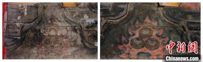 圖為1999年拍攝的長樂門內(nèi)檐彩畫顏料層顯色加固前后對比。(陜西師范大學歷史文化遺產(chǎn)保護教育部工程研究中心供圖)