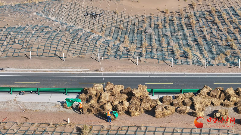 防沙治沙又一季,綠化造林年復(fù)年。這幾天,在金塔縣城至大墩門公路“三北”工程防沙治沙現(xiàn)場,一捆捆稻草正排著隊(duì)乘坐無人機(jī)前往沙漠深處。走進(jìn)壓沙現(xiàn)場,大家拉草埋沙,手提肩扛,或俯身鋪草,或揮鍬壓埋、填沙整型,分工明確、干勁十足。一臺(tái)壓沙車正在作業(yè),車輪駛過,稻草沙障便被植入沙漠里,劃線、鋪草、壓草,整個(gè)流程一氣呵成,效率大大提高。