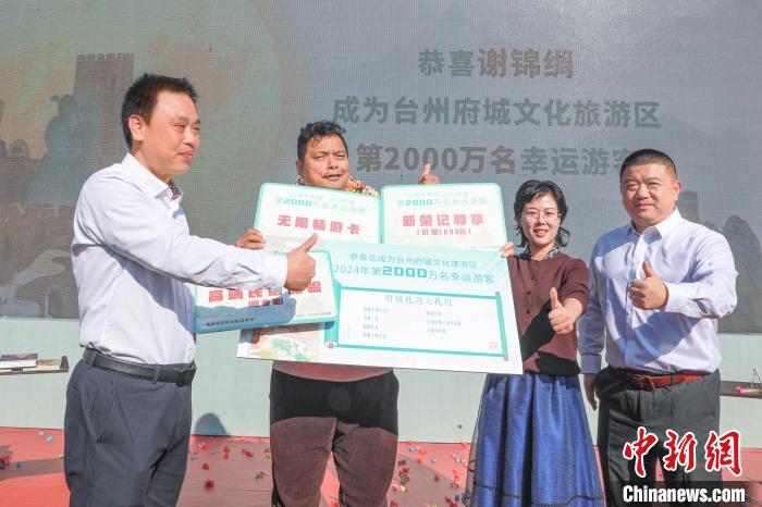 當日9時33分,臺州府城景區(qū)智慧旅游系統(tǒng)自動鎖定第2000萬名游客所在的一支來自福建的旅行團,經過數(shù)據(jù)確認和復核,確定旅行團成員謝錦綢為第2000萬名游客。臨海為其準備了包含大宋風華定制游、府城十味大禮盒、新榮記旗下品牌餐廳尊享券、臺州府城IP形象文創(chuàng)禮盒等禮品的“好事來臨”府城大禮包。