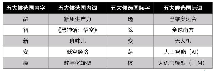 國(guó)內(nèi)字詞前五位分別是“融、智、新、安、穩(wěn)”和“新質(zhì)生產(chǎn)力、《黑神話:悟空》、班味兒、低空經(jīng)濟(jì)、數(shù)字化轉(zhuǎn)型”;國(guó)際字詞前五位分別是“選、戰(zhàn)、變、蕩、核”和“巴黎奧運(yùn)會(huì)、全球南方、無(wú)人機(jī)、人工智能(AI)、大語(yǔ)言模型(LLM)”。