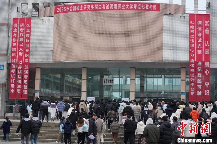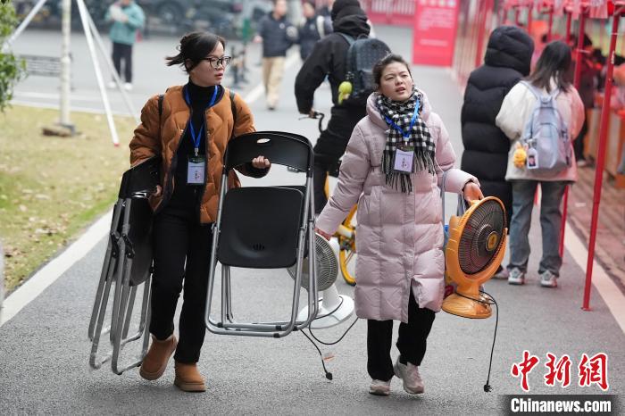12月21日,2025年全國(guó)碩士研究生招生考試初試開考,眾多考生來到湖南農(nóng)業(yè)大學(xué)考點(diǎn)參考。據(jù)教育部數(shù)據(jù)顯示,2025年全國(guó)碩士研究生報(bào)名人數(shù)為388萬,相比去年下降50萬人,已是連續(xù)兩年報(bào)名人數(shù)下降。圖為志愿者將椅子與取暖設(shè)備送入考場(chǎng)。中新社記者 楊華峰 攝