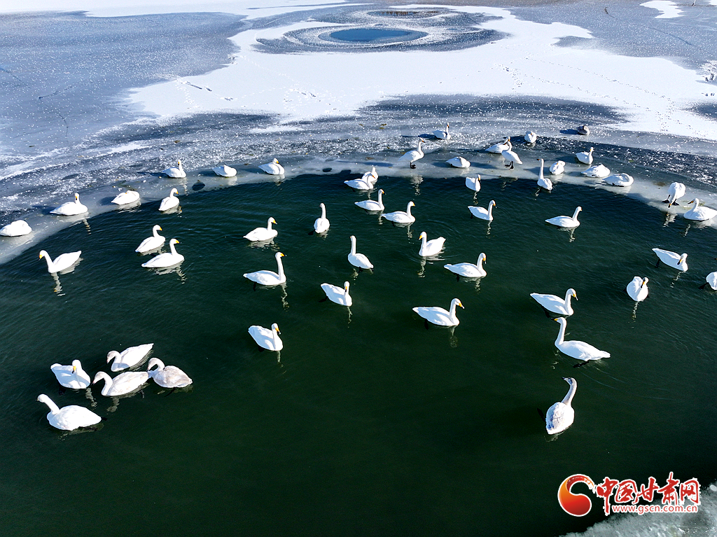 近日,在甘肅省張掖國家濕地公園,成群的越冬天鵝在冰封的湖面上悠然覓食、嬉戲,構(gòu)成了一幅動人的生態(tài)畫卷,成為冬日里一道尤為引人注目的風(fēng)景線。