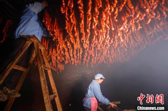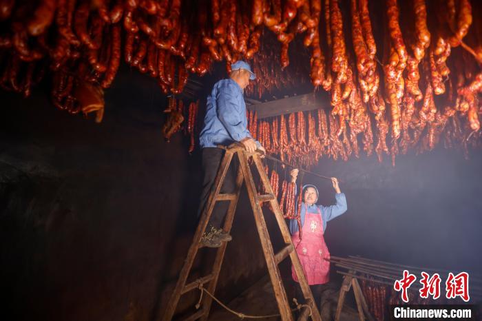 圖為貴州施秉一企業(yè)工人在下架剛熏制好的香腸。新年臨近,貴州省黔東南苗族侗族自治州施秉縣部分農(nóng)戶和企業(yè)紛紛加工趕制臘肉、香腸、血豆腐等傳統(tǒng)臘味,通過(guò)“線上+線下”銷(xiāo)售方式,供應(yīng)市場(chǎng),喜迎新年。磨桂賓 攝