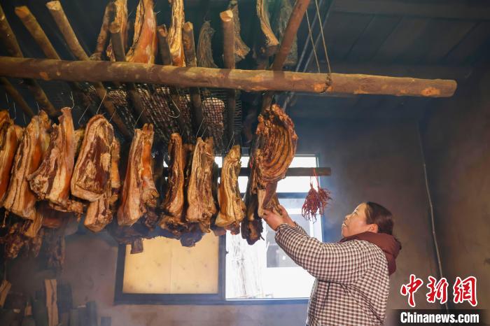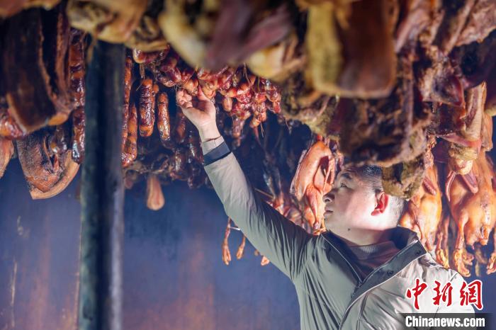 圖為貴州施秉云臺(tái)村一農(nóng)家樂(lè)業(yè)主在查看熏制臘肉、香腸的情況。磨桂賓 攝