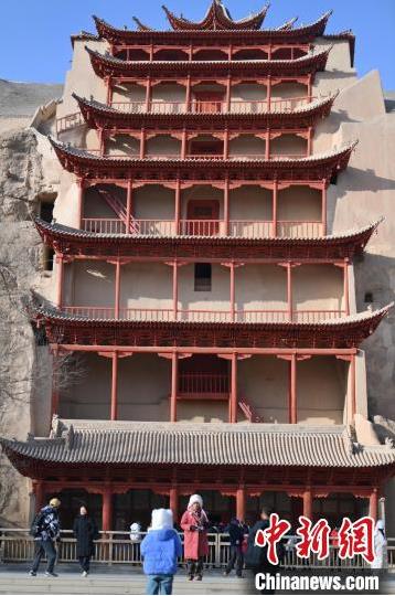 1月13日,甘肅敦煌莫高窟景區(qū)內(nèi),游人在莫高窟標(biāo)志性建筑九層樓前拍照打卡。據(jù)了解,從2024年12月1日至2025年2月28日,當(dāng)?shù)伉Q沙山月牙泉、玉門關(guān)、敦煌雅丹世界地質(zhì)公園等景區(qū)對國內(nèi)外所有游客免門票,莫高窟門票實(shí)行半價優(yōu)惠,開放洞窟由8個增加至10個,為游客提供了更為豐富的觀賞內(nèi)容。中新社記者 李亞龍 攝