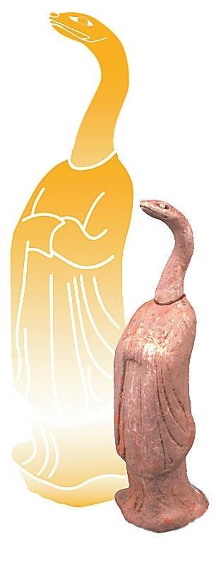 伏羲和女?huà)z是中國(guó)神話傳說(shuō)中的創(chuàng)世神靈,被視為人類(lèi)文明的始祖。相傳他們均為蛇身人首的形象,象征著自然與人類(lèi)的和諧統(tǒng)一。伏羲被認(rèn)為是發(fā)明八卦、結(jié)繩記事的智者,開(kāi)啟了中華文明的智慧之門(mén);而女?huà)z則以其神力摶土造人,煉石補(bǔ)天,維護(hù)了天地的秩序。展覽中展出的高臺(tái)縣博物館館藏的一件魏晉時(shí)期的女?huà)z圖彩繪壁畫(huà)磚。畫(huà)面繪女?huà)z,人首蛇身,獸足,頭梳高髻,著交領(lǐng)紅裳,右手持月輪,月輪內(nèi)有蟾蜍,左手持規(guī),周?chē)L云氣。同時(shí),還展出了一件高臺(tái)縣博物館館藏魏晉時(shí)期的伏羲女?huà)z畫(huà)像磚,左側(cè)女?huà)z,一手持矩、一手拿陰物,人首、蛇身、獸足、挽高髻、著交領(lǐng)長(zhǎng)衣,腹部繪月輪;右側(cè)伏羲,右手持規(guī),左手持日,內(nèi)有一金烏,周?chē)茪猸h(huán)生,意在天界暢游。兩磚拼合形成陰陽(yáng)交合圖,為墓葬中室頂部藻井彩繪圖像。畫(huà)像中人首蛇身的伏羲、女?huà)z形象,濃縮著中國(guó)上古時(shí)代的蛇崇拜意識(shí)。我國(guó)古代有天圓地方之稱(chēng),伏羲執(zhí)規(guī)象征天,女?huà)z執(zhí)矩象征地,反映了墓主人追隨升天的愿望,也期望其后代能夠繁衍生息。