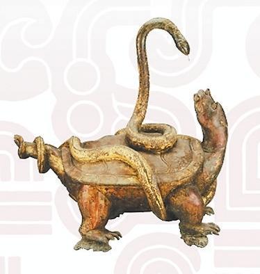 玄武是“四神”中的北方之神。《大戴禮》:“龜上彎象天,下平法地。千載神龜,問(wèn)無(wú)不知,廣育無(wú)雄,以蛇為雄。故龜與蛇合謂玄武”。因此龜蛇形象的組合亦有陰陽(yáng)交接之意。除了瓦當(dāng)、畫(huà)像磚、雕塑外,古人還常將此二物繪于旗上,用于指揮軍隊(duì)、消災(zāi)避害之用。