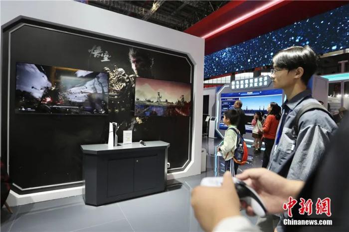 2024年11月5日至10日,第七屆中國(guó)國(guó)際進(jìn)口博覽會(huì)在上海舉辦。圖為11月9日觀眾在中國(guó)館體驗(yàn)游戲《黑神話:悟空》。中新社記者 王紫儒 攝