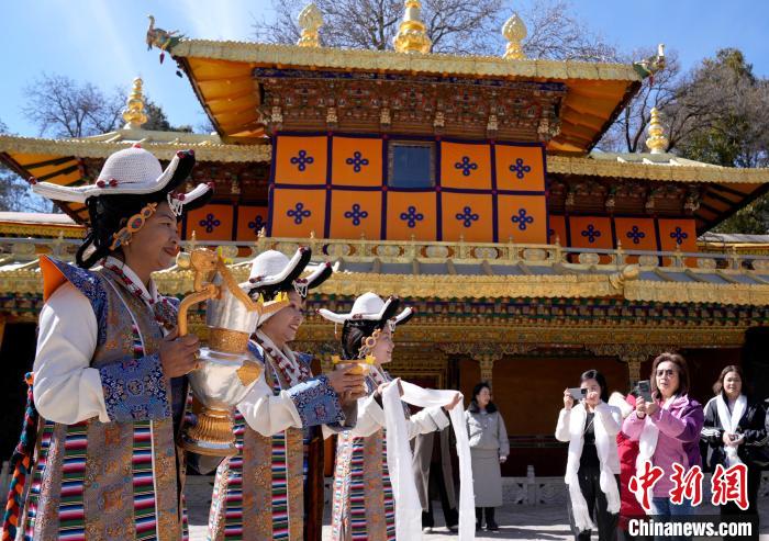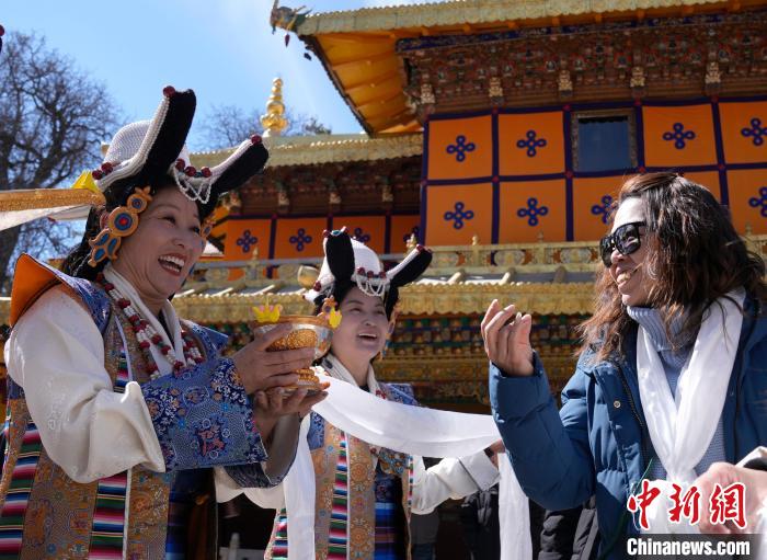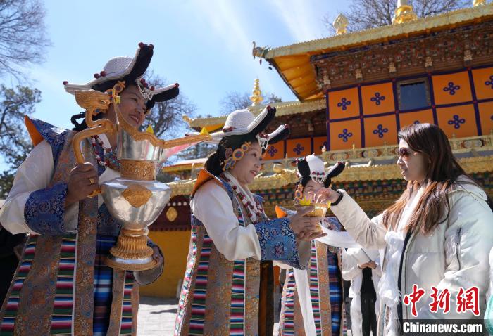 2月20日,由西藏自治區(qū)文化和旅游廳舉辦的2025年香港至拉薩航班首航旅行團(tuán)歡迎儀式在羅布林卡舉行。來自香港的游客將前往布達(dá)拉宮、大昭寺等地,開啟冬游西藏旅途。2月19日,拉薩至香港的首條地區(qū)航線正式開通。航線的開通,更加便捷了兩地居民的出行,也將進(jìn)一步促進(jìn)兩地在旅游、文化、經(jīng)貿(mào)等領(lǐng)域的交流與合作。圖為歡迎儀式現(xiàn)場,工作人員向香港游客敬獻(xiàn)青稞酒。中新社記者 李林 攝
