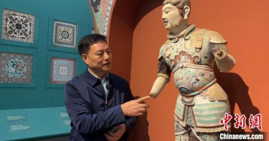 2023年2月,甘肅省蘭州市,汪萬福在敦煌藝術館向中新社記者介紹莫高窟第194窟南方增長天王塑像復制過程。 王牧雨 攝