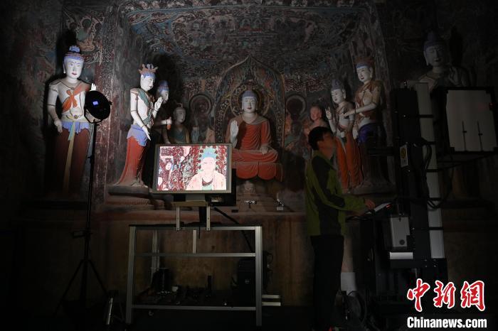 2024年6月5日,甘肅省敦煌市莫高窟內,敦煌研究院文物數(shù)字化研究所工作人員進行敦煌壁畫數(shù)字化采集工作?!≈行律缬浾?nbsp;李亞龍 攝