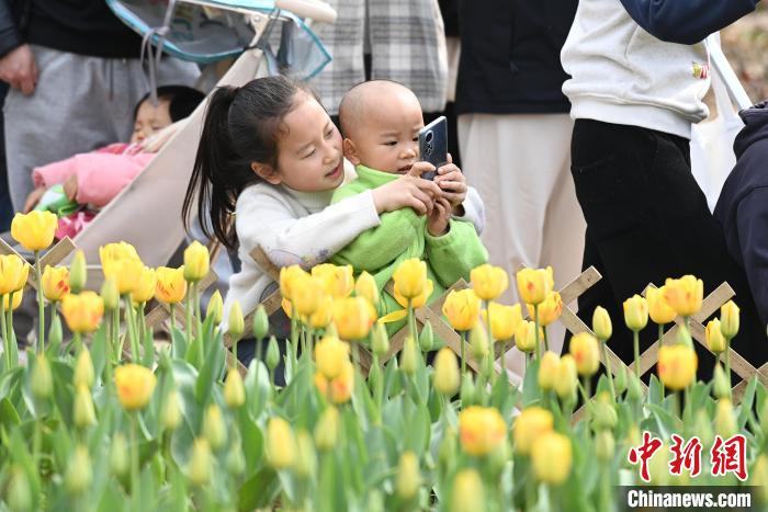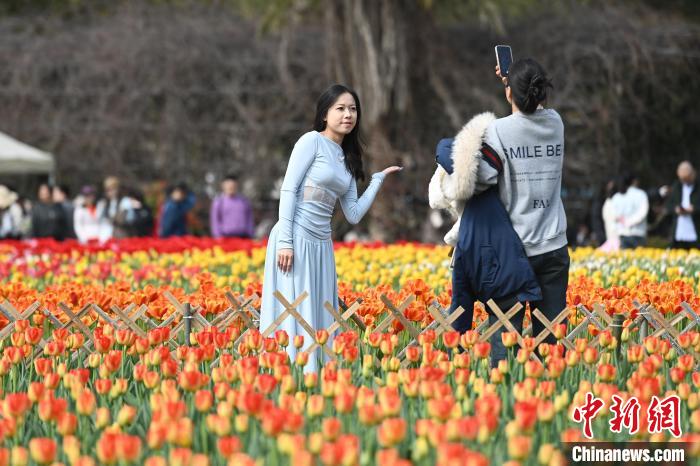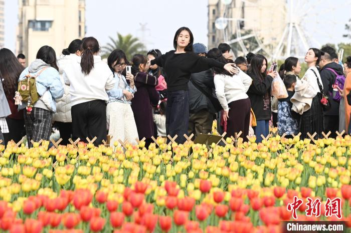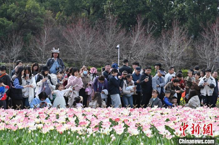 3月16日,位于湖南長沙的湖南省植物園數(shù)十萬株郁金香肆意綻放,五彩斑斕的花瓣交織成一片絢麗花海,引得眾多游人紛至沓來,享受愜意春日。圖為游人置身花叢中。中新社記者 楊華峰 攝