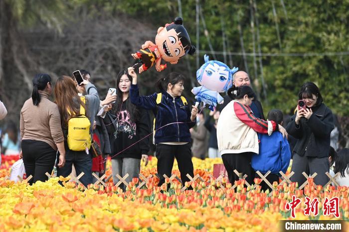 圖為游人拿著哪吒與敖丙的氣球賞花。中新社記者 楊華峰 攝