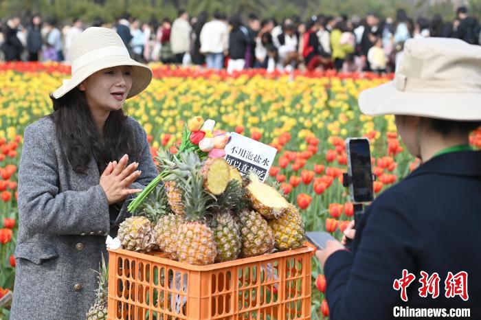 圖為商戶在花叢中進行直播帶貨賣鳳梨。中新社記者 楊華峰 攝