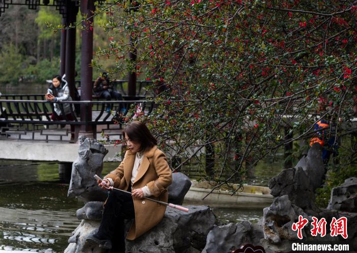 連日來,四川省成都市雙流區(qū)棠湖公園的海棠花競相綻放。纖細的花枝低垂,朵朵海棠嬌艷欲滴,散發(fā)著淡淡的芬芳,吸引市民紛至沓來。圖為3月16日,棠湖公園正大門處,垂絲海棠盛開,市民在此拍照打卡。韓金雨 攝