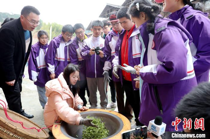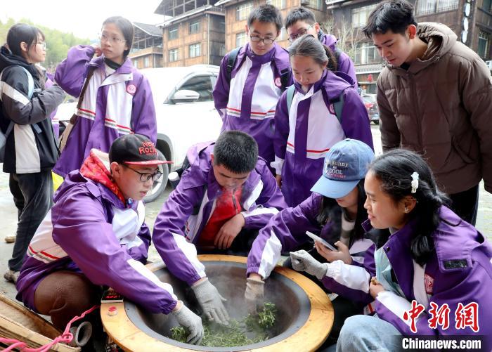 3月15日至16日,廣西柳州市一所中學(xué)組織千人研學(xué)團(tuán)到三江侗族自治縣八江鎮(zhèn)布央村仙人山景區(qū)開展茶文化研學(xué)活動(dòng),沉浸式采春茶、炒春茶、品春茶,深入了解茶種植、茶制作、茶文化、茶品鑒等知識(shí),進(jìn)一步培養(yǎng)實(shí)踐能力、提高勞動(dòng)素養(yǎng)。圖為研學(xué)活動(dòng)現(xiàn)場(chǎng)。龔普康 攝