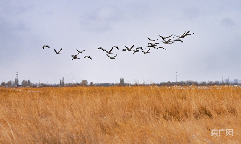 千只灰鶴在嘉峪關(guān)草湖國(guó)家濕地公園振翅高飛(央廣網(wǎng)發(fā) 嘉峪關(guān)市融媒體中心供圖)