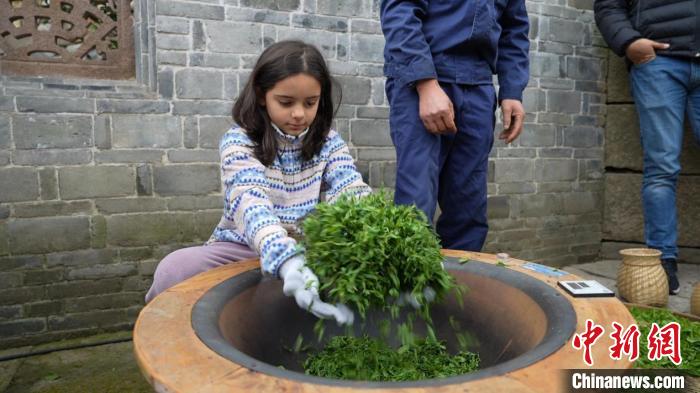 3月30日,來自巴西的游客奧莉薇體驗(yàn)炒茶?!≈旌I?nbsp;攝