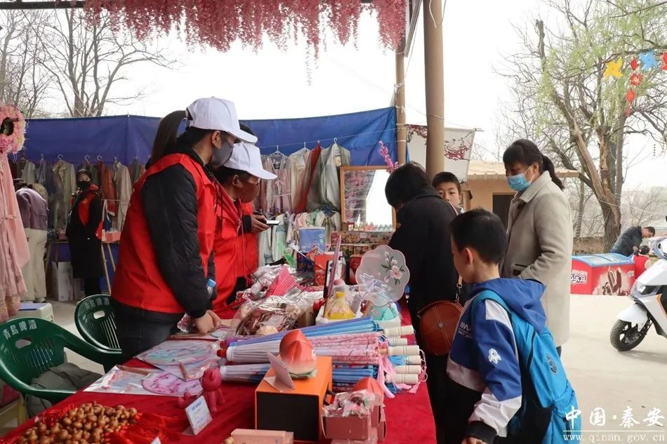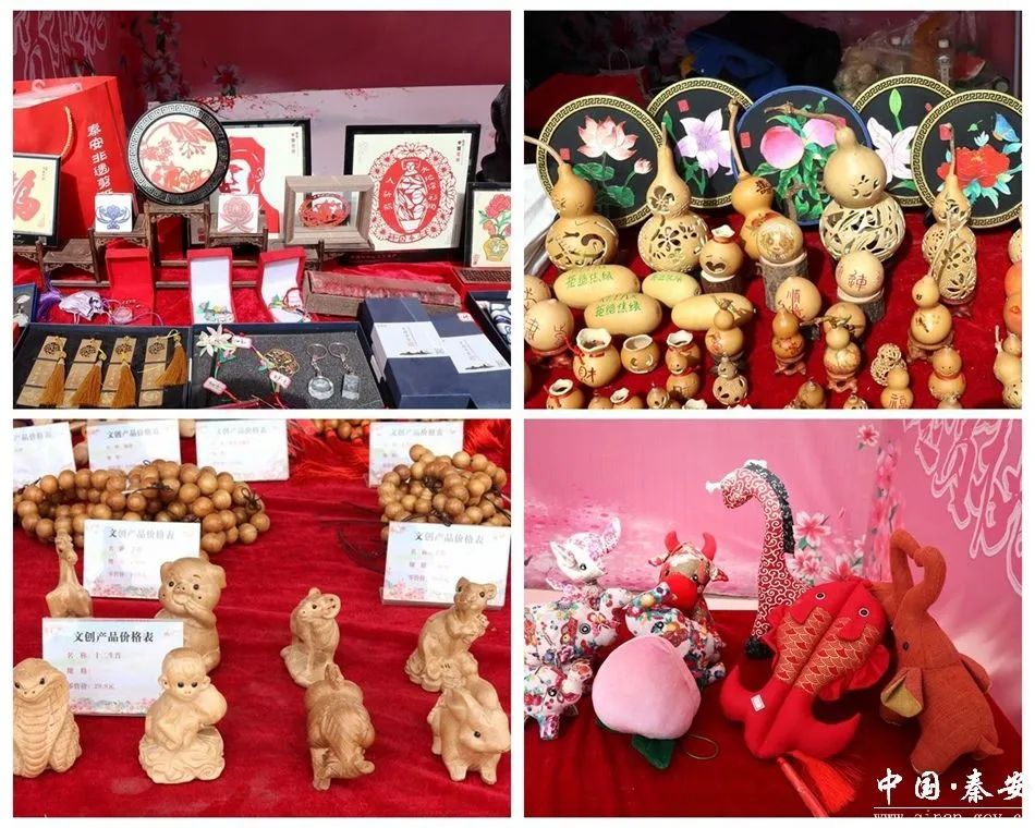 文創(chuàng)攤位前同樣人氣爆棚。精美的桃花折扇、雕花書簽、桃花傘,印著大地灣文化IP“小祖宗”的帆布包,寓意吉祥的桃木雕刻,以及麥稈編、剪紙等非遺手工藝品,每件都承載著秦安文化底蘊。攤主熱情地為顧客介紹產品的來歷與寓意,偶爾還會講述一些背后的創(chuàng)作背景故事,引得大家頻頻點頭稱贊。