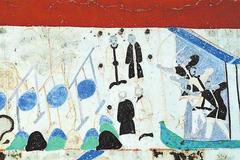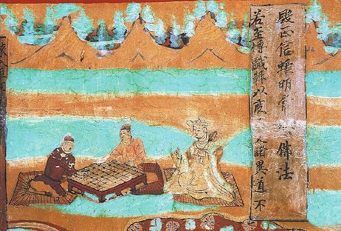 在敦煌壁畫中有關對弈的內(nèi)容較多。在莫高窟第454窟、第7窟壁畫中都有“弈棋圖”。兩幅圖的畫面有不少類似的地方:一是畫師較為突出棋盤的位置,兩幅壁畫中的棋盤都居中且形制相對巨大;二是畫面上的人物均為三人,兩人對弈,一人觀戰(zhàn),“觀棋不語真君子”;三是對弈者身后的景色都是天朗氣清、遠山含黛。據(jù)說,一天,北宋大文豪蘇東坡與摯友黃庭堅正在松樹底下弈棋。一陣風吹來,松果掉進棋盤。蘇東坡隨即吟道:“松下圍棋,松子每隨棋子落。”黃庭堅馬上回答道:“柳邊垂釣,柳絲常伴釣絲懸。”雅趣十足。其實,棋局里的一動一靜、一招一式無不需要謹小慎微、穩(wěn)扎穩(wěn)打。而對弈時的當斷則斷、示假隱真、有效合作等戰(zhàn)術不僅是對弈的智慧,也是人生的哲理吧。